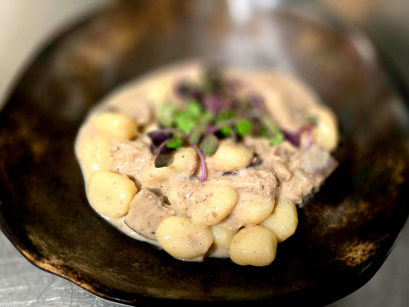 Gnocchis acompañados de lechazo (cordero I.G.P. CyL)